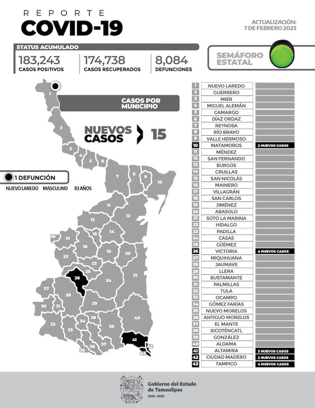 Confirman un deceso y 15 nuevos casos de Covid en Tamaulipas.