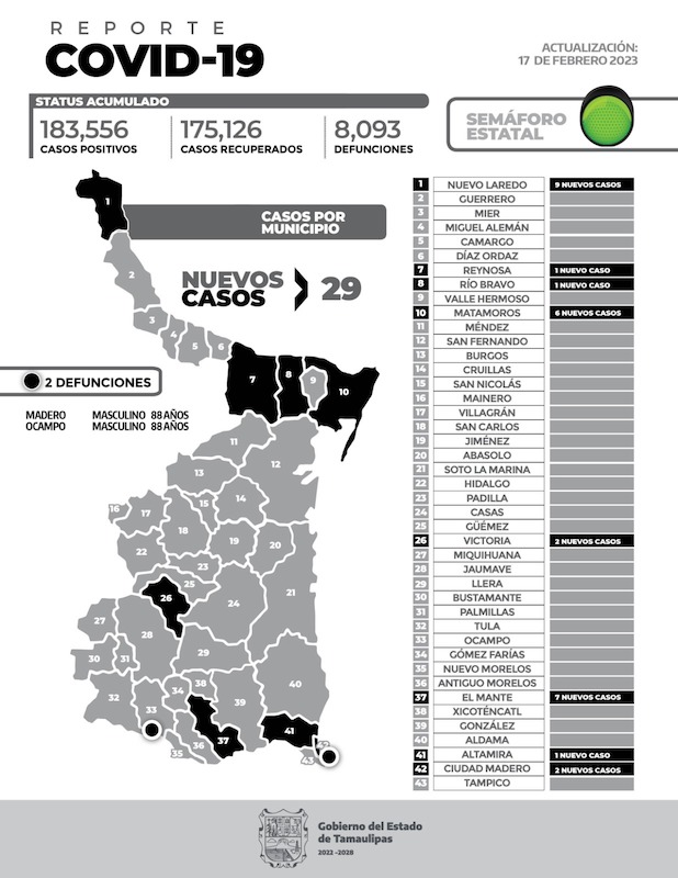 El reporte epidemiológico de COVID-19 de las últimas 24 horas sumó 29 nuevos casos y 2 defunciones, informó el secretario de Salud, Vicente Joel Hernández Navarro, al exhortar a los tamaulipecos a seguir con las medidas para prevenir este padecimiento como el lavado frecuente de manos, el estornudo de etiqueta y la sana distancia. Reiteró […]