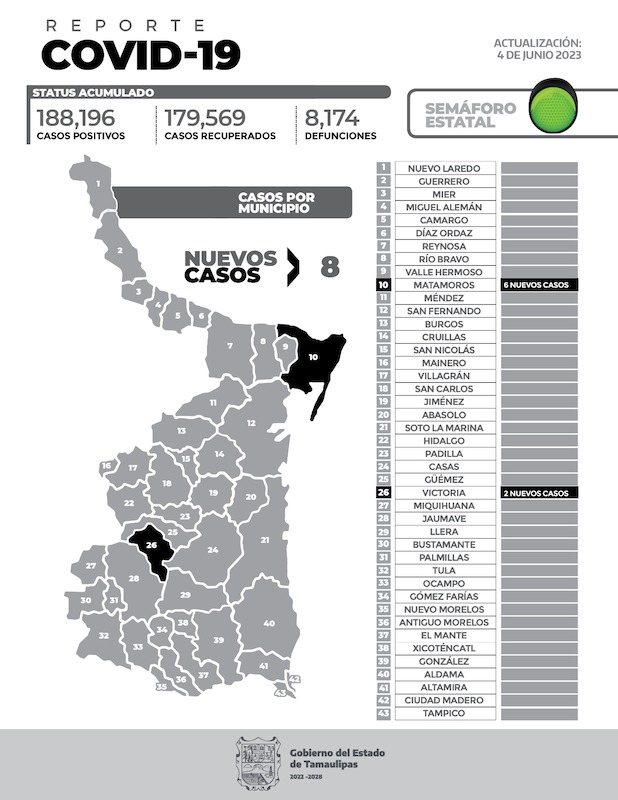 Los casos diagnosticados este domingo de COVID-19 en la entidad suman 8 nuevos pacientes y sin fallecimientos. A la fecha en Tamaulipas se han registrado 188 mil 196 casos desde el inicio de la pandemia. Aunque los casos graves y fallecimientos por COVID-19 han disminuido, el virus que causa la enfermedad sigue activo, por ello […]