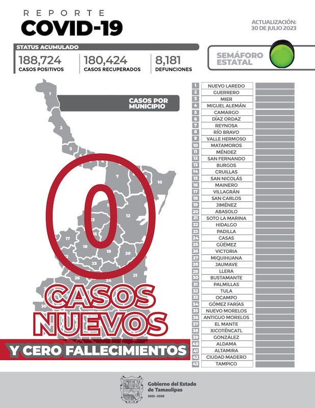 Reporta Tamaulipas, cero casos de Covid-19 y sin fallecimientos.