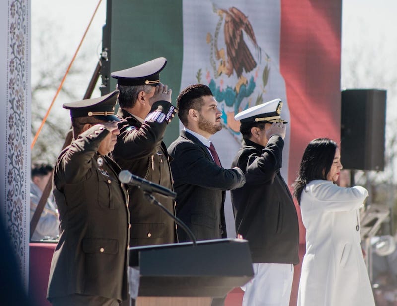 La presidenta municipal Carmen Lilia Canturosas Villarreal encabezó la conmemoración del Día de la Bandera en una solemne ceremonia cívica realizada en el Décimo Sexto Regimiento de Caballería Motorizado de Nuevo Laredo.