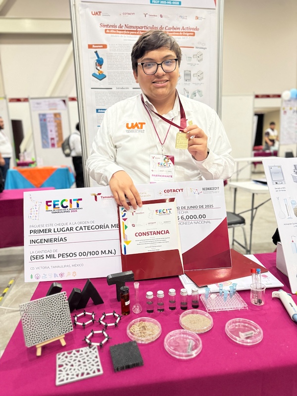 El joven Luis Fernando Aguiñaga experimenta el uso de nanopartículas de carbono activado obtenidas del bagazo de caña para generar materiales antioxidantes con aplicaciones biomédicas que ayuden a eliminar células cancerígenas.