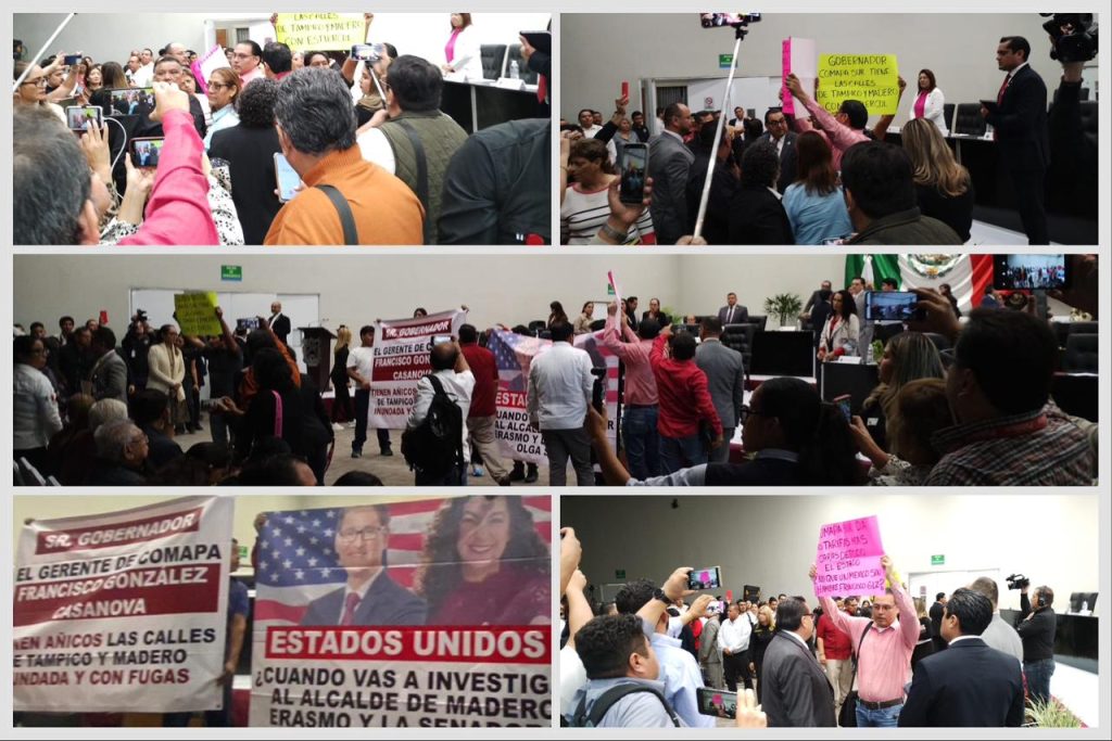 La sesión itinerante del Congreso del Estado celebrada este jueves en el Centro de Convenciones de Tampico estuvo a punto de ser suspendida luego de que un grupo de manifestantes irrumpió en el recinto mientras se desarrollaba la presentación de iniciativas. Durante la intervención del diputado de Altamira, Marcelo Abundis Ramirez un pequeño grupo de […]
