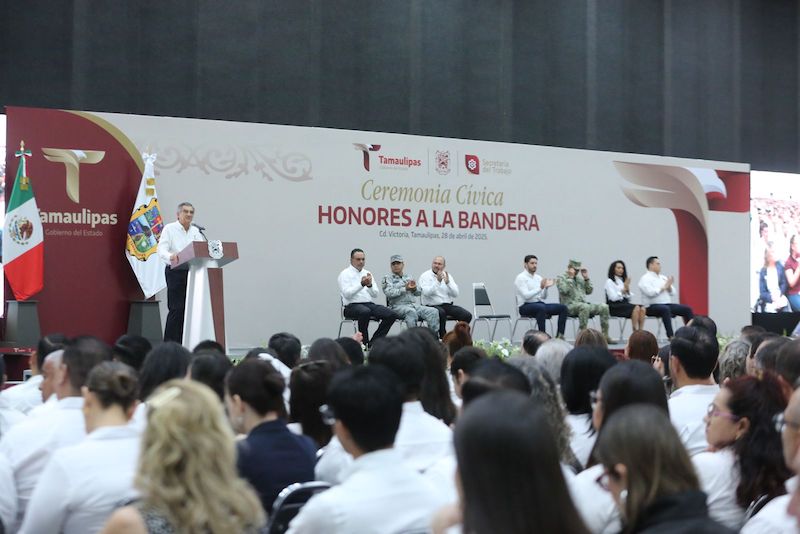 Durante la ceremonia de honores a la bandera, realizada en el Polyforum Rodolfo Torre Cantú, el mandatario destacó los avances en materia laboral impulsados en los últimos años en México, especialmente durante la administración del presidente Andrés Manuel López Obrador.
