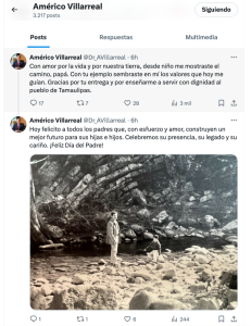 Minutos antes había escrito otro post más personal, un mensaje a su padre el ex gobernador Americo Villarreal Guerra: