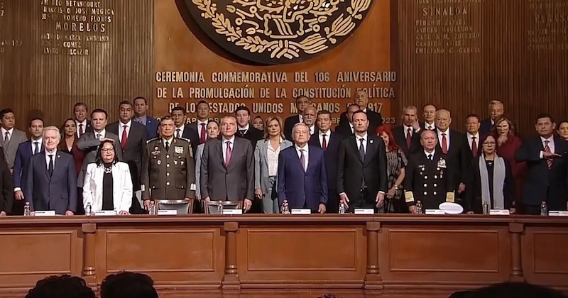 Con la totalidad de los gobernadores, gabinete legal y ampliado -excepto el canciller Marcelo Ebrard-, López Obrador aseveró que la Constitución vive en la transformación del México justo, igualitario, fraterno.